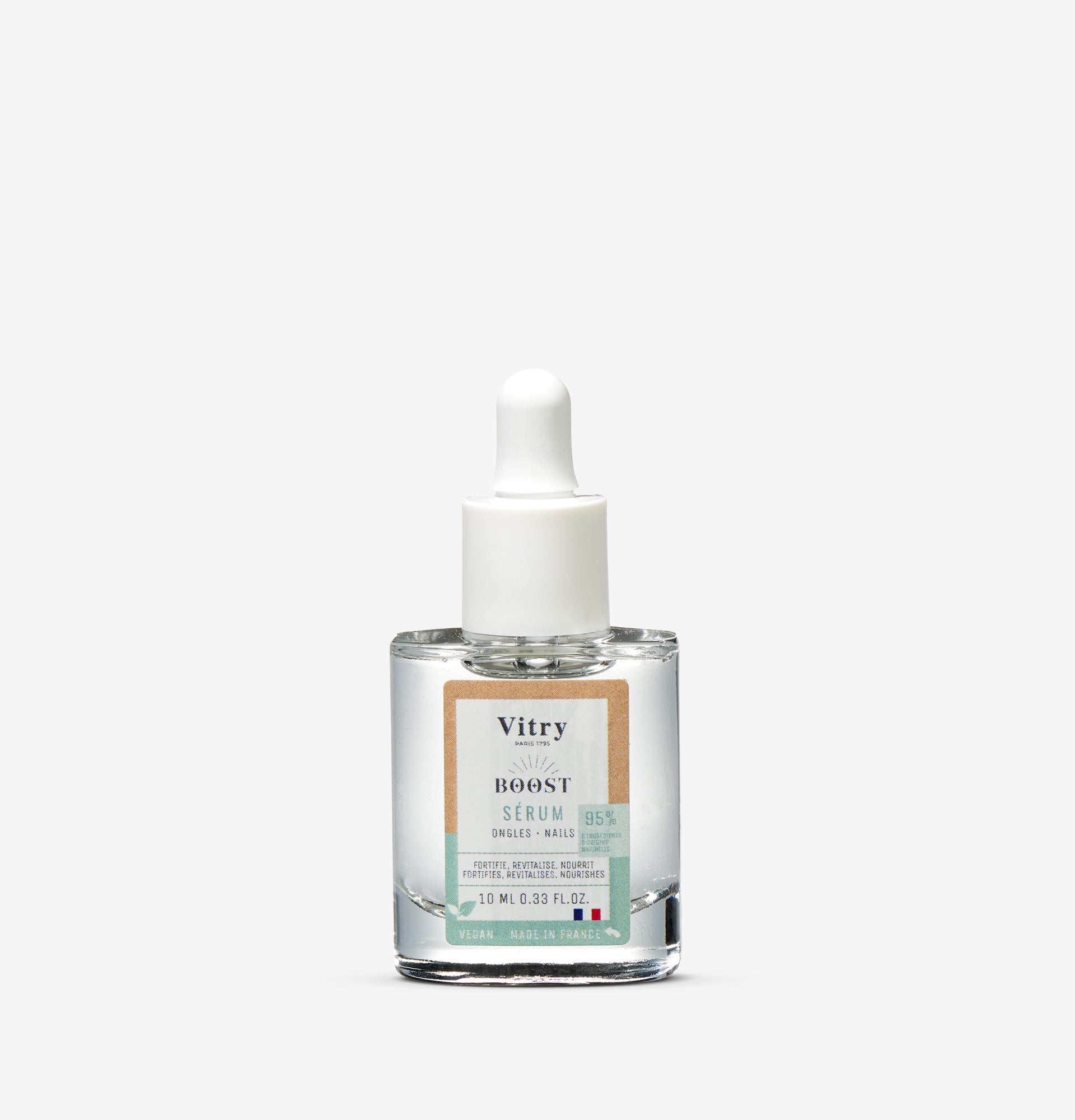 Le Boost Sérum Ongles Vitry est un soin expert pensé pour les ongles fragilisés, mous ou cassants. Sa formule vegan, composée à 95% d'ingrédients d'origine naturelle, associe l'extrait de rose noire, reconnu pour ses propriétés adoucissantes et revitalisantes, à l'urée, qui nourrit l'ongle.
